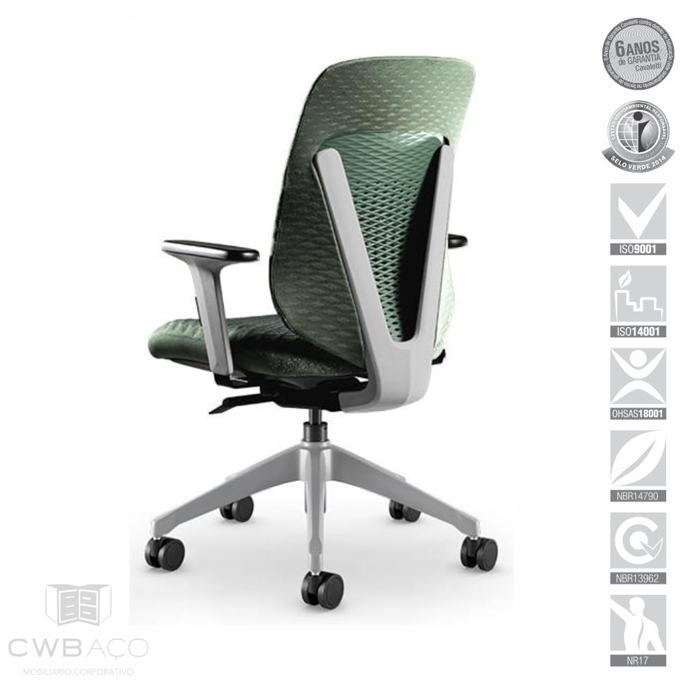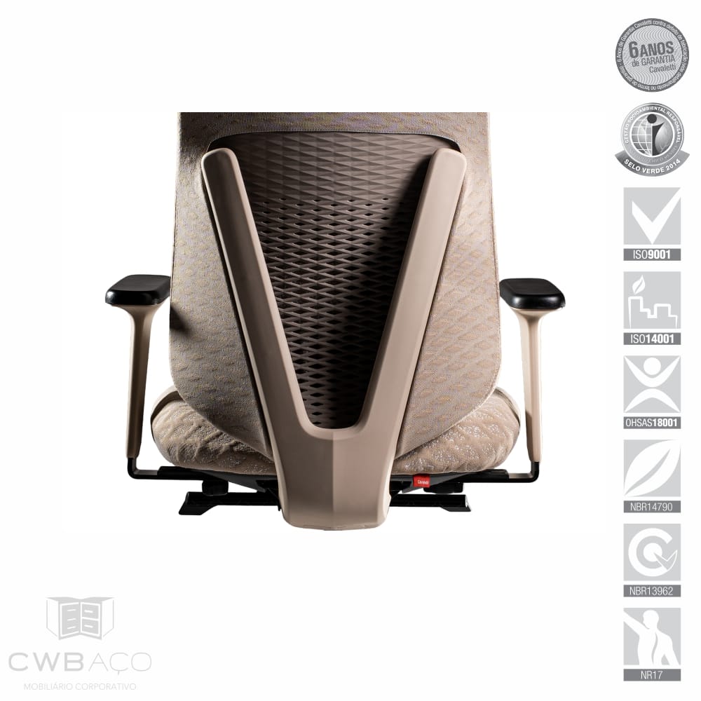 - Encosto: Lâmina injetada em compósito polimérico. Seu encosto flexível e com tecnologia avançada é revestido com tecido Tramma. Lâmina em Polímero acompanha a cor do revestimento.